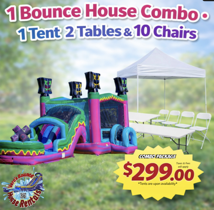 Purge Combo Package is a bundled rental option that gives you more than one fun attraction in a single convenient package, Purge combo package includes 1 Combo,1 tent, 2 tables and 10 Chairs. It is a practical choice for customers who want variety, convenience, and a standout party attraction in one package.